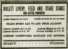 ![]() ![]() 1914 Advertisments for Aladdin Livery Barn and Aladdin-Hulett Stage Line