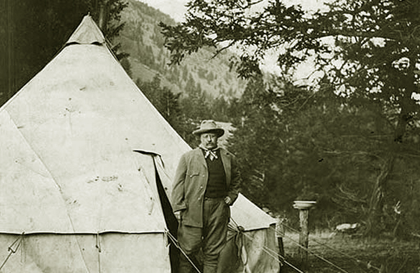 ![]() Presidential camp, Yellowstone Park, 1903. Roosevelt had previously hunted in Jackson's Hole and used Tazewell Woody as a guide. [Writer's note: Woody's first name is variously spelled "Tazewell" and "Taswell."] Roosevelt’s adventures, recounted in his 1893, “The Wilderness Hunter,” gave rise to a cowboy doggerel at the time of the Spanish American War in praise of Roosevelt and his guide: